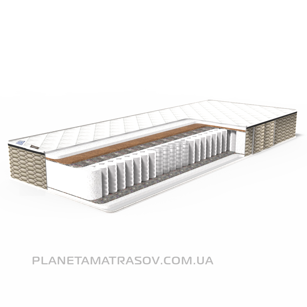 Двосторонній ортопедичний помірно-жорсткий матрац. У складі, з одного боку, кокосова койра додає матрацу жорсткість, розподіляє навантаження по поверхні і забезпечує оптимальну підтримку хребту. Інша сторона м'якше з використанням високо-еластичної піни Airfoam. Незалежні пружини кишенькового типу точково і максимально ефективно забезпечують грамотну підтримку тіла.