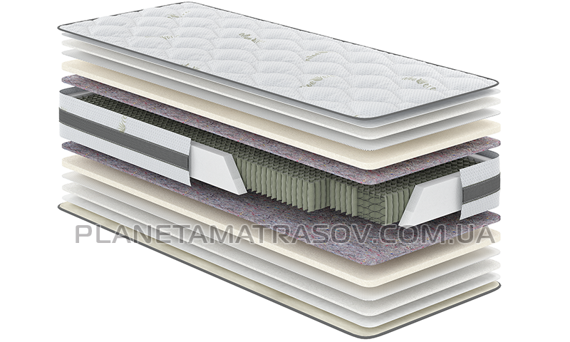 Двосторонній матрац, побудований за оптимальною схемою з комбінацією двох пін, спеціально для цього пружинного блоку. також він оснащений посиленим Єврокаркасом і тканиною з екстрактом Алое Віра, яка зшита з настильними шарами за технологією багатошарового стьобання. Аеро сітка допомагає вільної циркуляції повітря усередині матраца, так не накопичується зайва волога й не розмножуються хвороботворні організми.