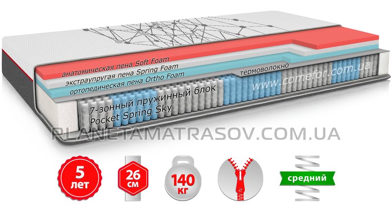 - Тип пружинного блоку: "Pocket Spring" 7 зон твердості