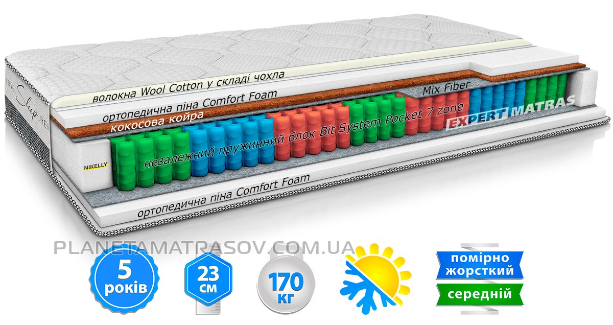 5. Bit System Pocket 7 zones – пружинний блок, розділений на 7 зон і виготовлений з пружин із застосуванням дроту різних діаметрів. Таке зонування допомагає матрацу максимально точно підлаштуватися під анатомію сплячої людини, надійно підтримуючи всі частини її тіла і допомагаючи легко розслабити м'язи під час сну.