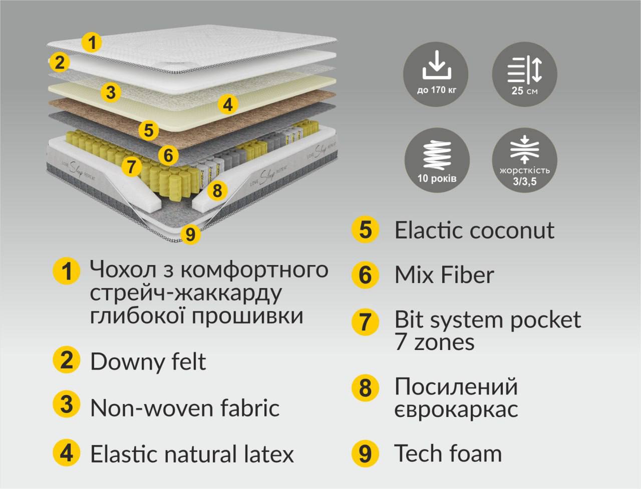 - Elastic natural latex – натуральний, екологічно чистий матеріал, який виробляється з соку гевеї (каучукового дерева). Цей пружний і, в той же час м'який матеріал, відрізняється хорошими ортопедичними властивостями і довговічністю. А його дихаючі якості і вологопропускна здатність робить його по-справжньому незамінним у виробництві ортопедичних матраців.