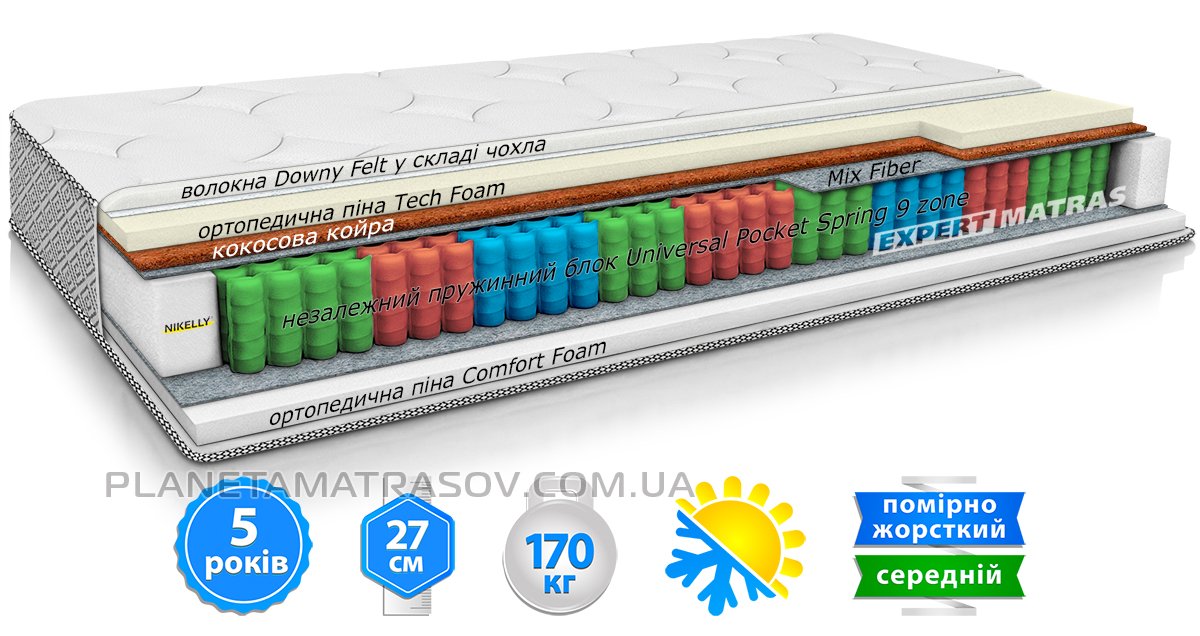 7. Space pocket spring 9 zones – в даному виді матраців використовується новітня система розміщення пружин. Завдяки розподілу по зонах забезпечується надійна підтримка усього тіла, а матрац має найкращі анатомічні якості. В зоні голови пружини бережно підтримують у зручному положенні всі шийні хребці, а в районі пліч вони підлаштовуються під анатомію сірої зони. Завдяки підтримці в зоні попереку виключені больові неприємні відчуття. Також підтримуються м'язи та та суглоби в зонах, де розміщуються стегна та коліна. Підтримка в зоні гомілок дає можливість м'язам максимально розслабитись, що виключає можливість защемлення нервових закінчень.