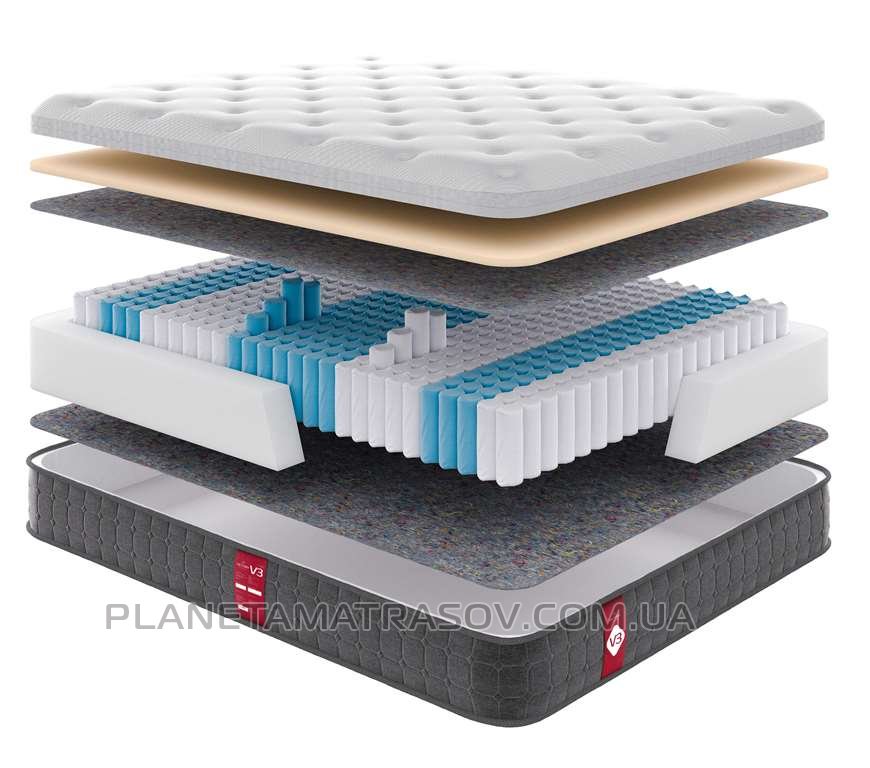 В ортопедическом матрасе Victory V 3 идеально сочетаются прочная основа, средняя жесткость и эффект памяти. Семь зон пружинного блока Pocket Spring Sky 7 равномерно принимают вес спящего, обеспечивая правильное положение тела. Блок пружин изолирован прослойкой термовойлока. А оптимальную среднюю жесткость формирует износостойкая пена Mono Foam. Эффект памяти, который так любит каждый сантиметр тела, создает пенный материал Visco Memory. Он точно, но деликатно повторяет ваши контуры, даря расслабляющий и восстанавливающий сон.