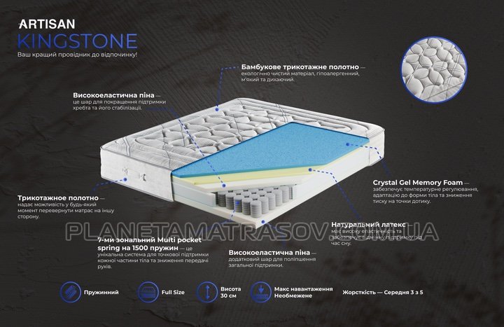 - Наповнювачі: натуральний латекс, Crystal Gel Memory Foam, Cloud Foam