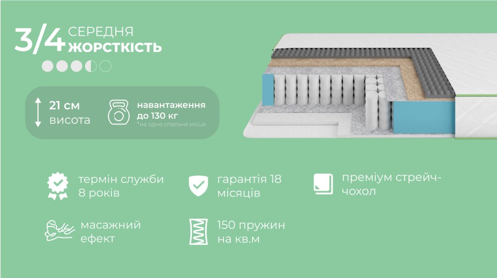 Уровень жесткости «Средний 3» обеспечивает оптимальный баланс между поддержкой и комфортом. Матрас не слишком мягкий, чтобы проваливаться, и не слишком жесткий, чтобы создавать дискомфорт. Он подходит для людей, которым важно правильное положение позвоночника во время сна, но при этом они хотят ощущать легкую мягкость и упругость поверхности. Средняя жесткость - универсальный выбор для большинства людей с разными предпочтениями в отношении комфорта.