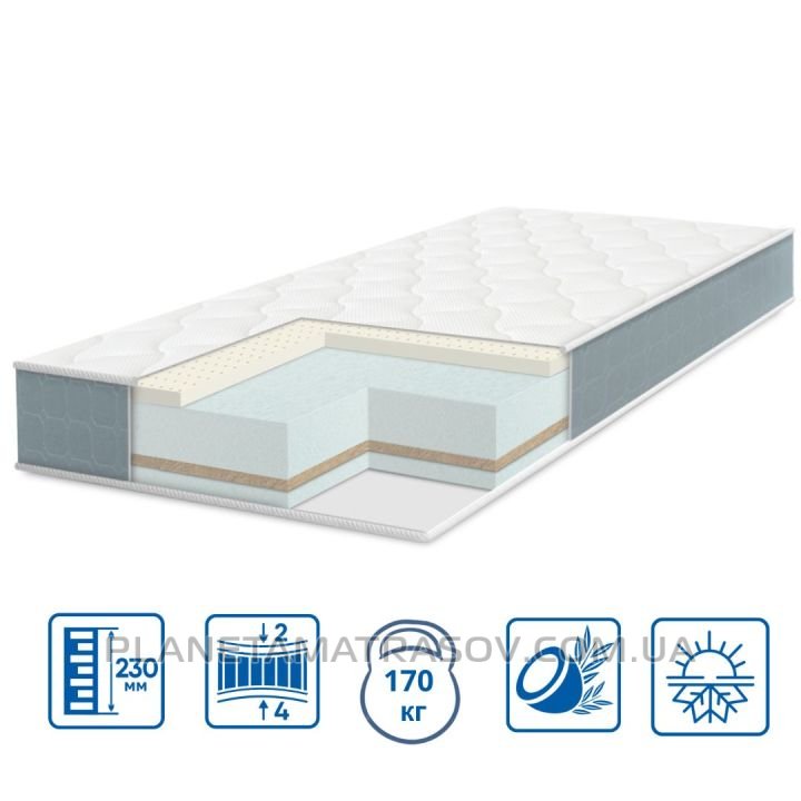 Эта модель матраса имеет две разные стороны жесткости и подойдет для тех, кто ищет более жесткий матрас с кокосовой койрой. Этот качественный и долговечный матрас позволяет своему владельцу выбрать наиболее комфортную сторону для сна, и минимизирует возможность неправильного подбора жесткости матраса. Ведь всегда у вас будет возможность перевернуть матрас на более удобную сторону. Матрас имеет современный привлекательный вид и выполнен в чехле из высококачественной трикотажной ткани. Наполнение состоит из монолитной основы из эластичной пены высокой плотности, производимой на мощных и ведущих отраслевых предприятиях Европы, также с одной стороны присутствует латексированная кокосовая койра для добавления жесткости стороне, на которой она используется.