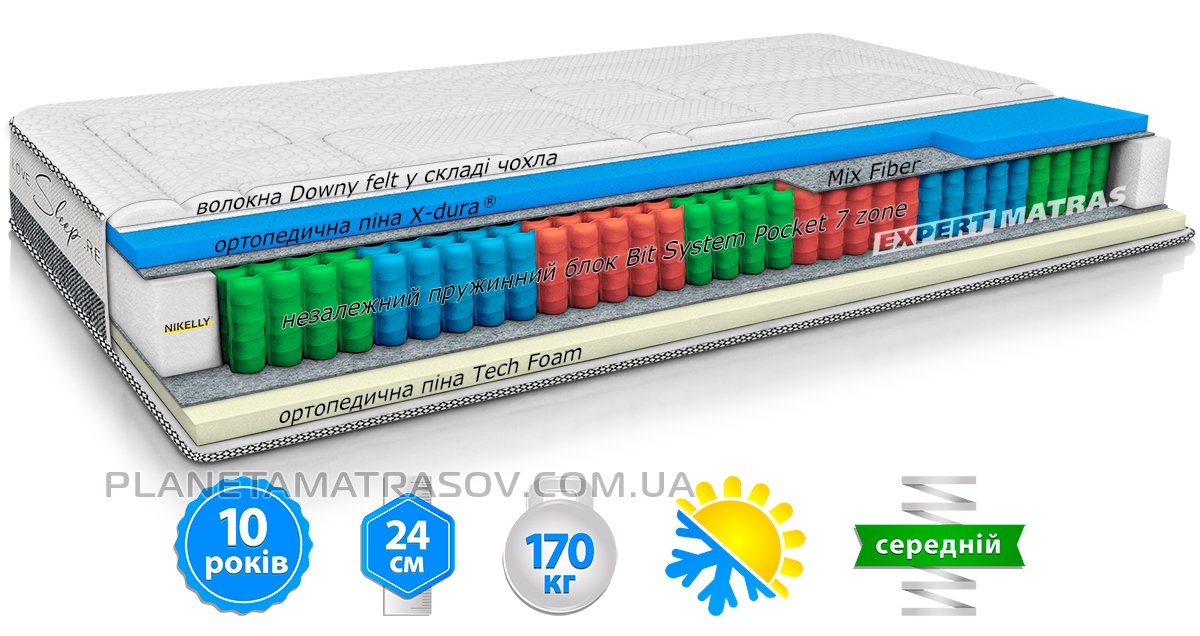 6. Bit system pocket 7 zones – пружинний блок, розділений на 7 зон і виготовлений з пружин із застосуванням дроту різних діаметрів. Таке зонування допомагає матрацу максимально точно підлаштуватися під анатомію сплячої людини, надійно підтримуючи всі частини її тіла і допомагаючи легко розслабити м'язи під час сну.