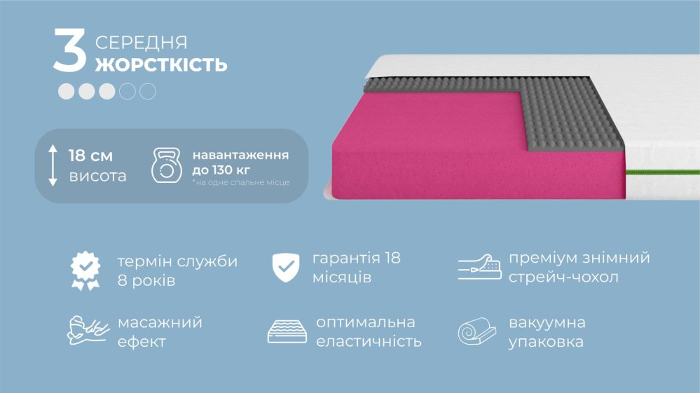 Рівень жорсткості "Середній 3" забезпечує оптимальний баланс між підтримкою і комфортом. Матрац не надто м'який, щоб провалюватися, і не надто жорсткий, щоб створювати дискомфорт. Він підходить для людей, яким важливе правильне положення хребта під час сну, але при цьому вони хочуть відчувати легку м'якість і пружність поверхні. Середня жорсткість - універсальний вибір для більшості людей з різними уподобаннями щодо комфорту.