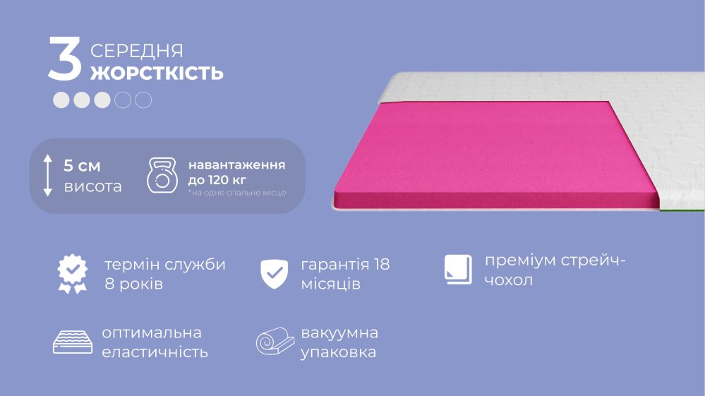 Жорсткість "Середня 3" — ідеальний вибір для топера, що забезпечує збалансовану підтримку та комфорт. Такий рівень жорсткості не дозволяє тілу провалюватися, зберігаючи природне положення хребта, але водночас додає поверхні м’якої пружності. Топер із середнім рівнем жорсткості підходить більшості користувачів — він зручний для сну в будь-якій позі та стане відмінним рішенням для поліпшення якості відпочинку на дивані чи матраці.