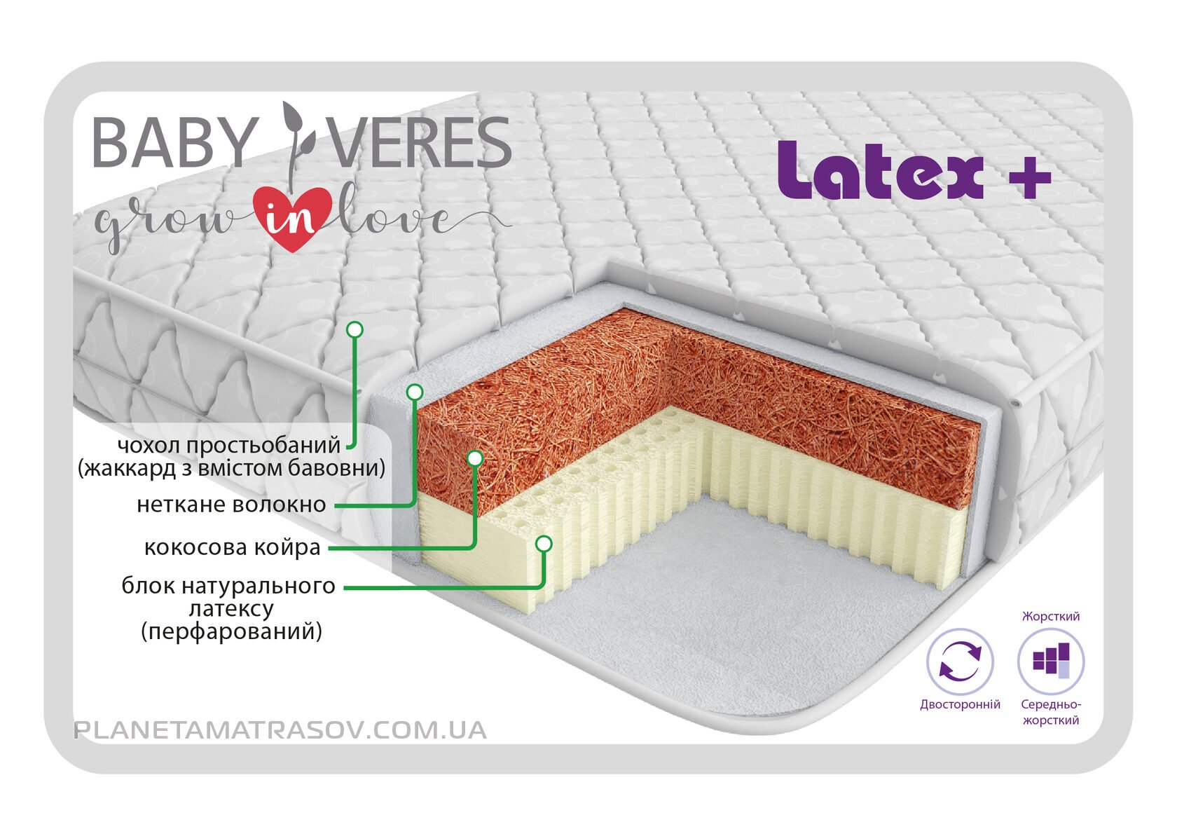 Latex + 12 – матрац серії «Ecology» має двосторонню основу: з одного боку – кокосова койра, яка забезпечує необхідну жорсткість для підтримки ще не зовсім сформованого хребта дитини в правильному положенні. З іншого – блок натурального латексу для дитини після року. Завдяки перфорованому латексу матрас відмінно дихає і вентилюється. Приймає форму тіла під час сну, підтримуючи хребет дитини в правильному положенні, здатний витримувати великий тиск, відмінно відновлює свою первинну форму.