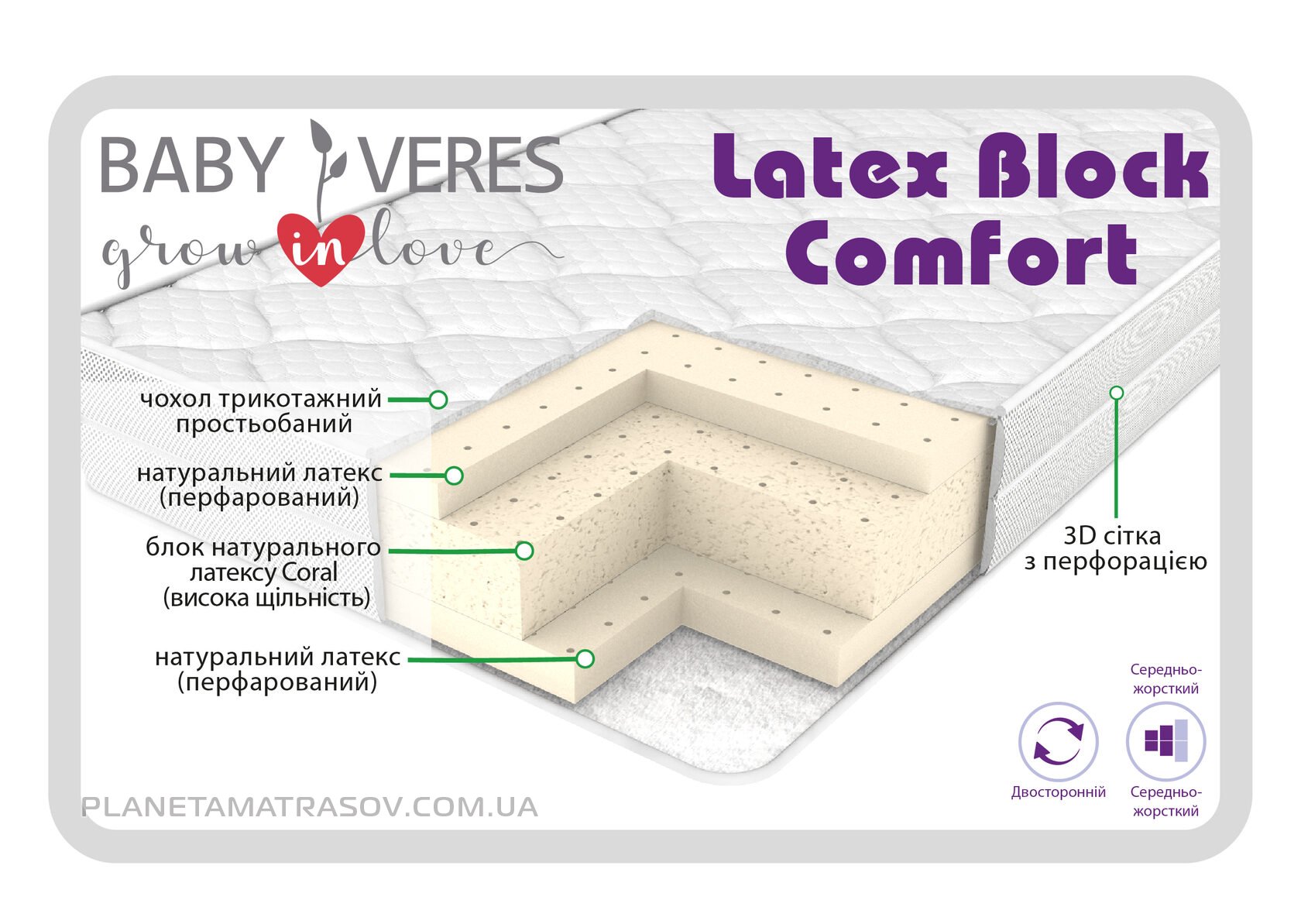 на основі блоку натурального латексу, який завдяки обробці термічним шляхом має високу щільність та підвищену жорсткість. З 2-х сторін перфорований натуральний латекс середньої щільності – це забезпечує правильну підтримку хребта та правильне формування скелетно-м’язової системи дитини. Відмінно витримує будь-яке навантаження, не деформується навіть при потраплянні та перебуванні вологи всередині. Підходить для використання від народження. Чохол на блискавці – подвійний трикотаж; по периметру матрацу перфорована 3D сітка для ефективнішого провітрювання матрацу.
