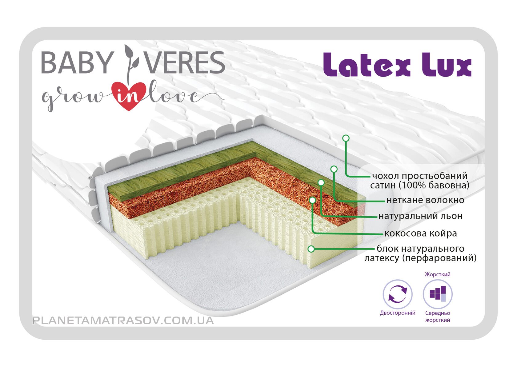 Latex LUX - матрац серії «Ecology» має двосторонню основу: з одного боку - кокосова койра , яка забезпечує необхідну жорсткість для підтримки ще не зовсім сформованого хребта дитини в правильному положенні та ізольована 100 % довговічним льоном, який не здавлює м'які тканини, сприяючи правильному формуванню скелетно-м'язової мускулатури. З іншого - блок натурального латексу для спання дитини після року. Завдяки перфорованому латексу матрац відмінно дихає і вентилюється. Приймає форму тіла під час сну , підтримуючи хребет дитини в правильному положенні, здатний витримувати великий тиск, відмінно відновлює свою первинну форму.